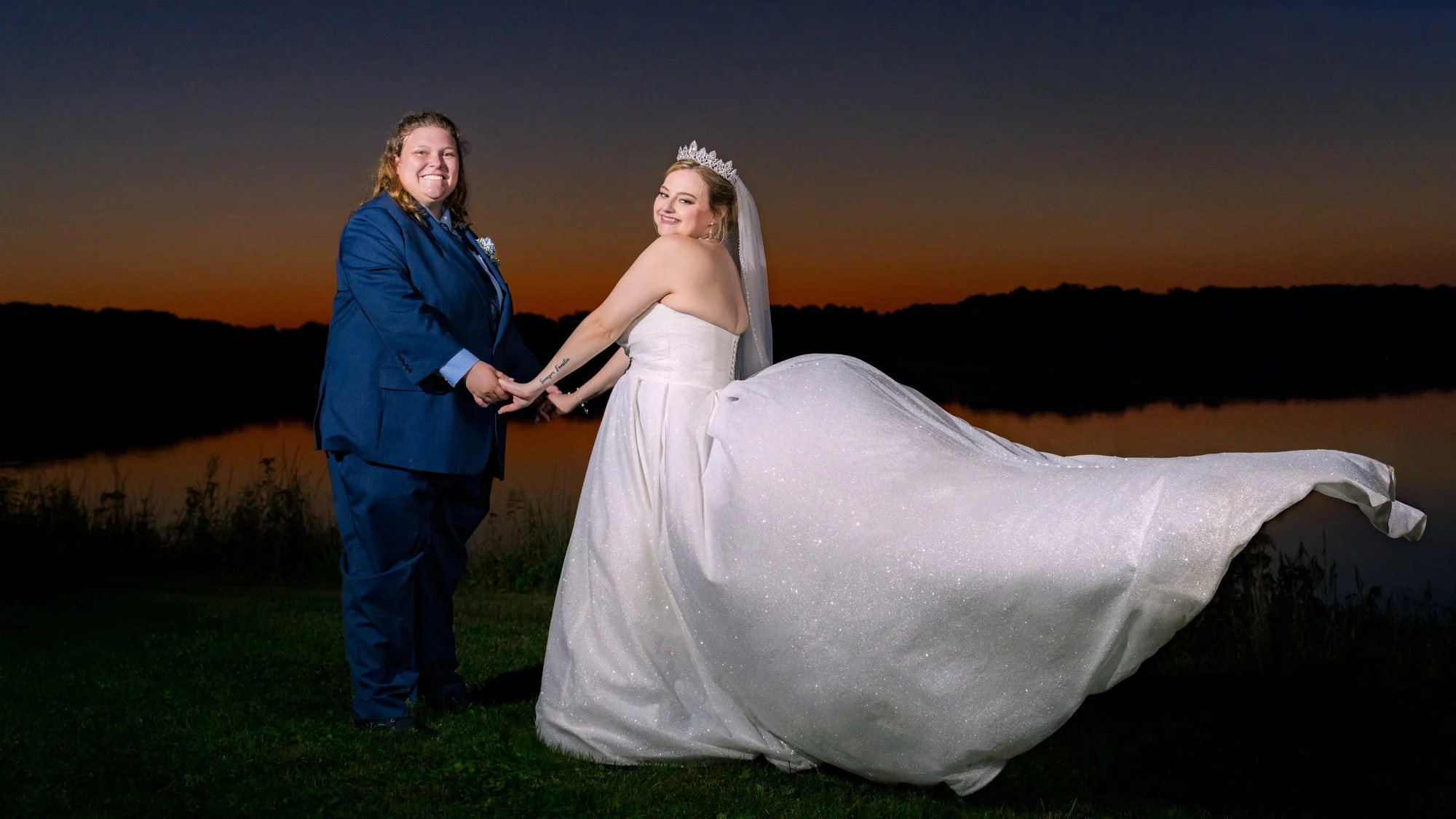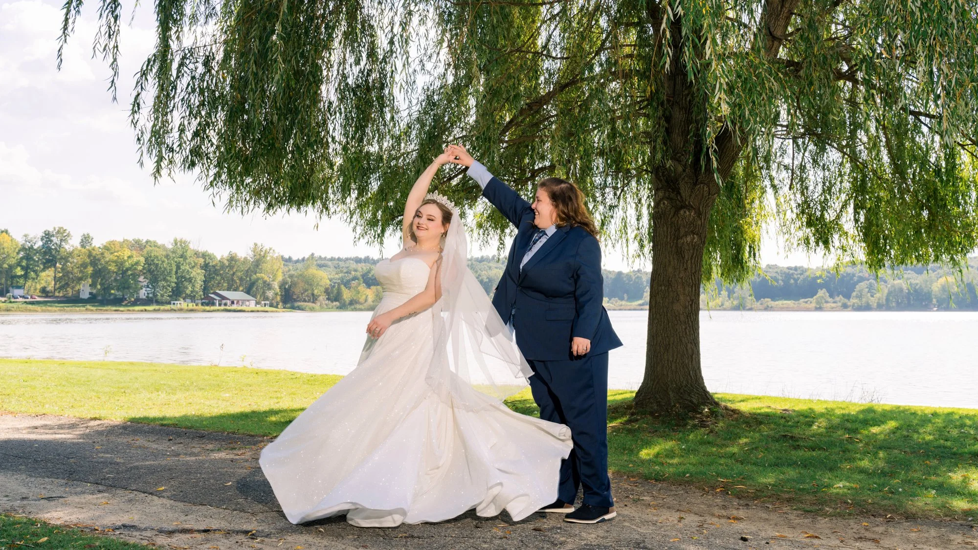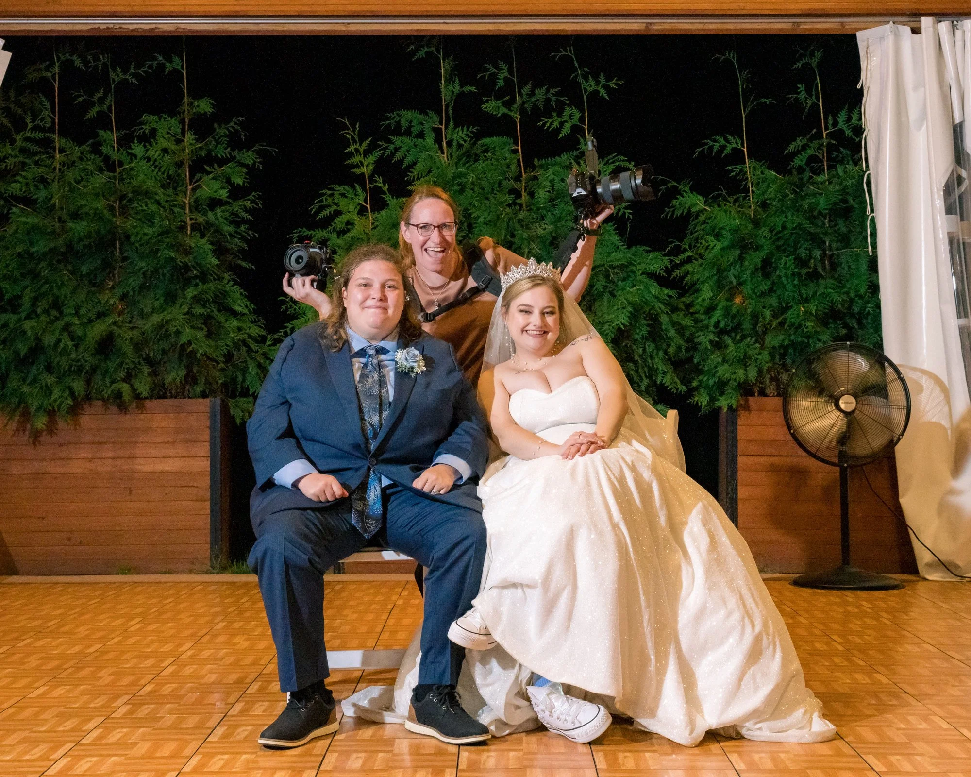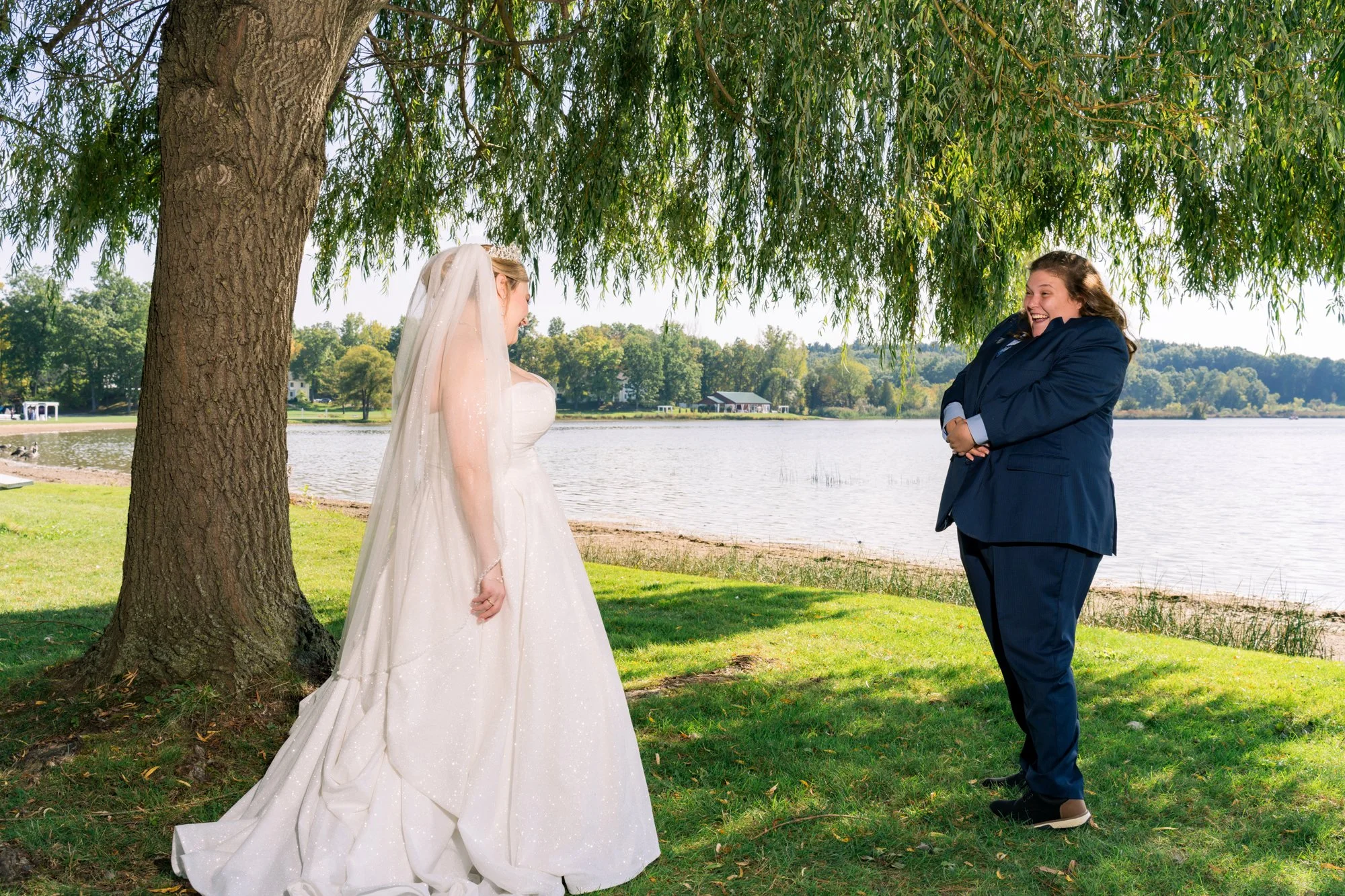 As the sun started to drop, we stepped out again for sunset portraits — warm light pouring across the lake, soft golden tones in the trees, and two brides completely in the moment. Those images were the perfect close to an already unforgettable day.